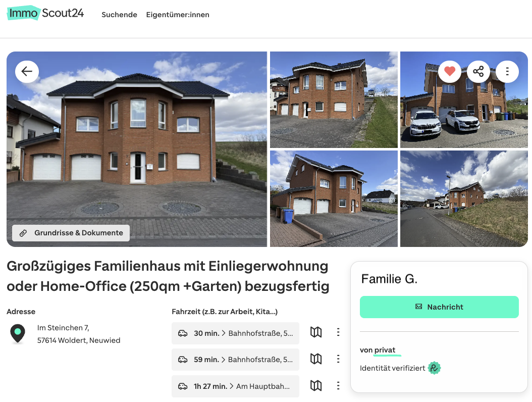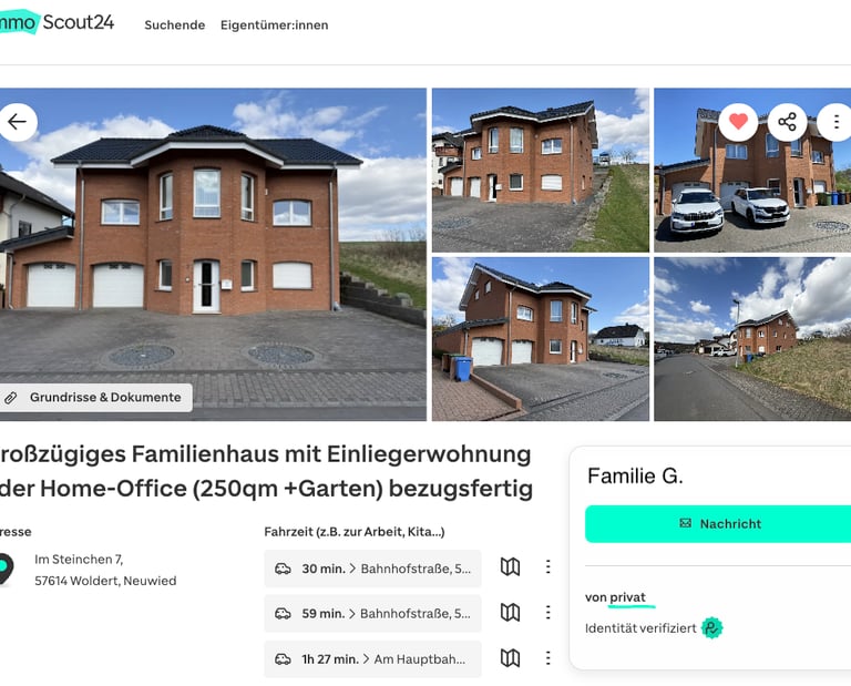 Die Website www.woldert.immo ist unsere private, leicht zu merkende Internet-Adresse, mit der wir ausschließlich auf unser primäres Inserat bei ImmoScout24 aufmerksam machen. Es handelt sich nicht um ein Unternehmen (i.S.v. Maklerei); es werden keine Dienstleistungen oder Produkte angeboten und es besteht keine Absicht, entgeltliche Verträge über diese Seite abzuschließen. Weitere Verlinkungen, insbesondere zu Plattformen wie Instagram, Kleinanzeigen o.Ä., dienen ausschließlich Informations- und Ansichtszwecken sowie der Transparenz für Interessierte.